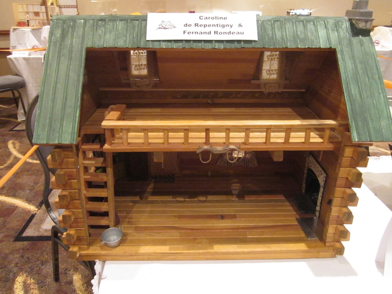 I ended the last post with a full dollhouse by Caroline de Repentigny and Fernand Rondeau so I thought I would start today's by showing you most of the other pieces from this talented pair that were on display at the Montreal show, beginning with the log cabin that is meticulously crafted. Being unfurnished allows us to see all the beautiful joints and other details we might otherwise miss.