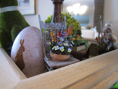 In the front you can see one of my green turf bunnies and another large speckled egg as well as a beautifully-aged press-backed chair holding a pot of pansies and other mixed flowers.  This gorgeous little piece was made by Debbie Bettaglia-Fawcett and I was lucky enough to receive it as a “giftie” at Camp Mini Ha Ha a few years ago.